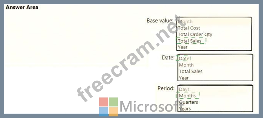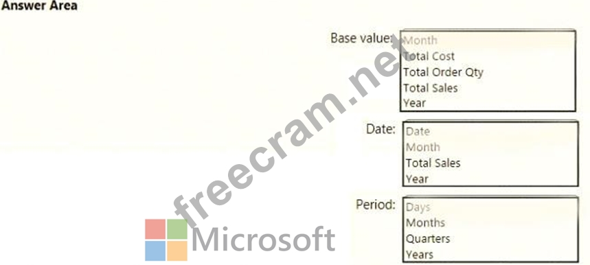 Explanation Box 1: Total Sales We select the field Total Sales Box 2: Date Select a date field. Box 3: Month Monthly periods. Reference: https://docs.microsoft.com/en-us/power-bi/transform-model/desktop-quick-measures