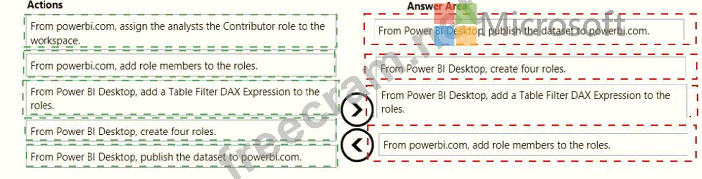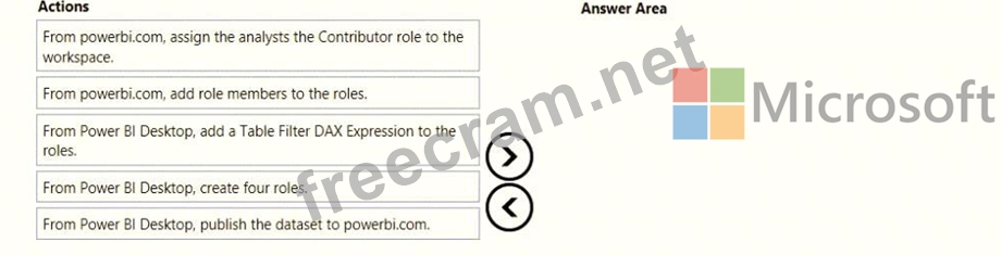 Once the profit and loss dataset is created, which four actions should you perform in sequence to ensure that the business unit analysts see the appropriate profit and loss data? To answer, move the appropriate actions from the list of actions to the answer area and arrange them in the correct order.