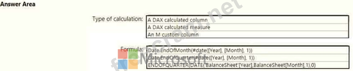 You plan to relate the balance sheet to a standard date table in Power Bl in a many-to-one relationship based on the last day of the month. At least one of the balance sheet reports in the quarterly reporting package must show the ending balances for the quarter, as well as for the previous quarter.