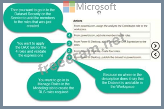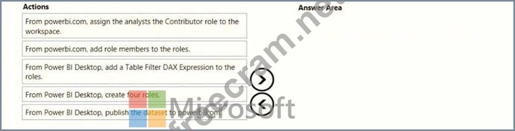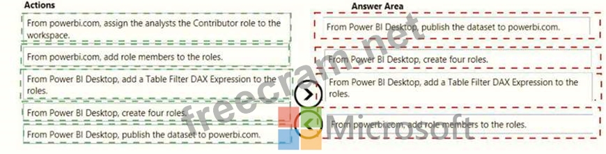 Once the profit and loss dataset is created, which four actions should you perform in sequence to ensure that the business unit analysts see the appropriate profit and loss data? To answer, move the appropriate actions from the list of actions to the answer area and arrange them in the correct order.