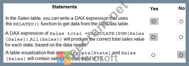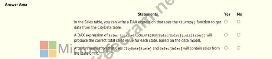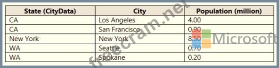 You are creating a Microsoft Power Bl model that has two tables named CityData and Sales. CityData contains only the data shown in the following table.