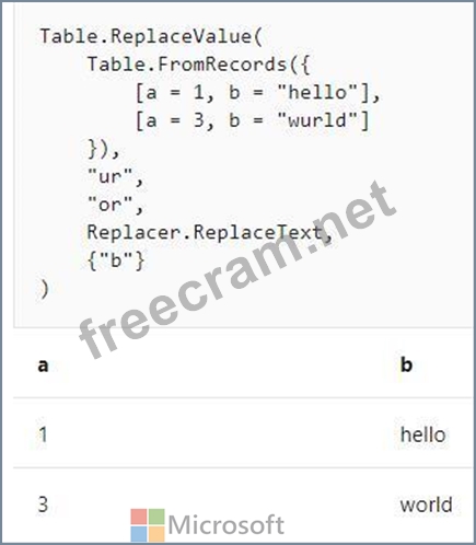 Explanation Example: Replace the text "ur" with the text "or" in the table. Reference: https://docs.microsoft.com/en-us/powerquery-m/table-replacevalue