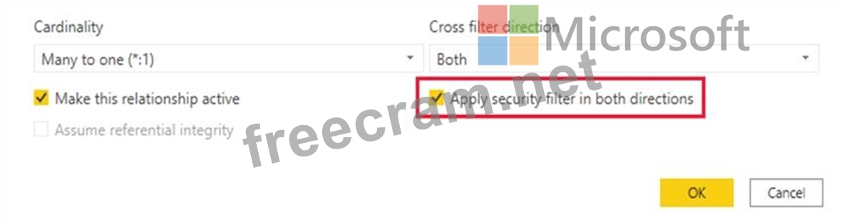 By default, row-level security filtering uses single-directional filters, whether the relationships are set to single direction or bi-directional. You can manually enable bi-directional cross-filtering with row-level security by selecting the relationship and checking the Apply security filter in both directions checkbox. Select this option when you've also implemented dynamic row-level security at the server level, where row-level security is based on username or login ID.