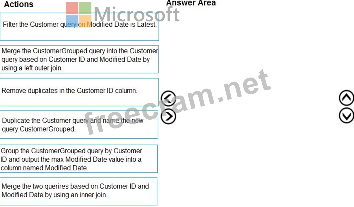 You have a query named Customer that imports CSV files from a data lake. The query contains 500 rows as shown in the exhibit. (Click the Exhibit tab.) Each file contains deltas of any new or modified rows from each load to the data lake. Multiple files can have the same customer ID. You need to keep only the last modified row for each customer ID. Which three actions should you perform in sequence? To answer, move the appropriate actions from the list of actions to the answer area and arrange them in the correct order.