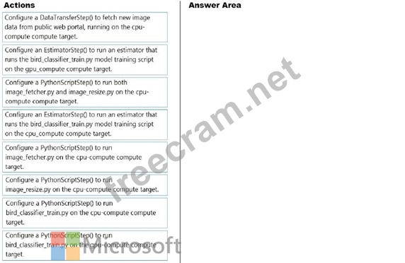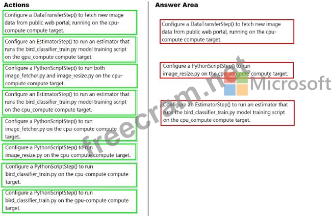 Which three pipeline steps should you run in sequence? To answer, move the appropriate actions from the list of actions to the answer area and arrange them in the correct order.