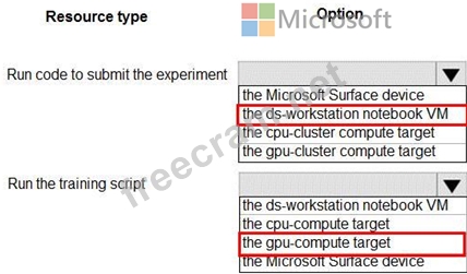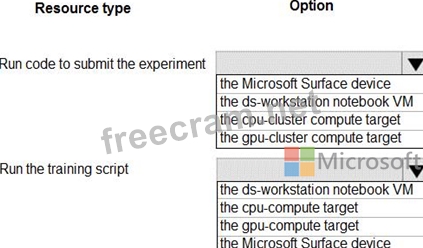 a Microsoft Surface device on which Microsoft Office has been installed. Corporate IT policies prevent the installation of additional software a Compute Instance named ds-workstation in the workspace with 2 CPUs and 8 GB of memory an Azure Machine Learning compute target named cpu-cluster with eight CPU-based nodes an Azure Machine Learning compute target named gpu-cluster with four CPU and GPU-based nodes You need to specify the compute resources to be used for running the code to submit the experiment, and for running the script in order to minimize model training time.
