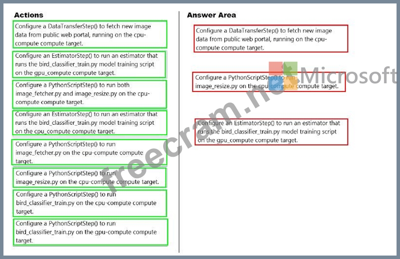 Which three pipeline steps should you run in sequence? To answer, move the appropriate actions from the list of actions to the answer area and arrange them in the correct order.
