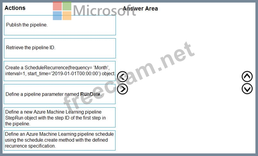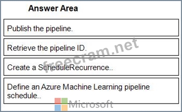 The model must be retrained monthly with the new image data fetched from a public web portal. You create an Azure Machine Learning pipeline to fetch new data, standardize the size of images, and retrain the model.