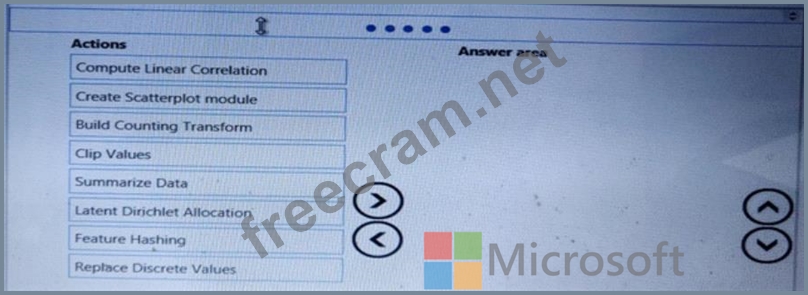 Which three Azure Machine Learning Studio modules should you use in sequence? To answer, move the appropriate modules from the list of modules to the answer area and arrange them in the correct order.
