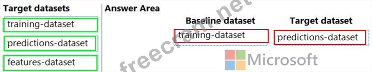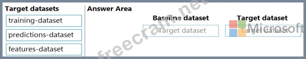 Which datasets should you use to configure the data drift monitor? To answer, drag the appropriate datasets to the correct data drift monitor options. Each source may be used once, more than once, or not at all. You may need to drag the split bar between panes or scroll to view content.