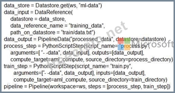 process_step_output = PipelineData("processed_data", datastore=datastore) process_step = PythonScriptStep(script_name="process.py", arguments=["--data_for_train", process_step_output], outputs=[process_step_output], compute_target=aml_compute, source_directory=process_directory) train_step = PythonScriptStep(script_name="train.py", arguments=["--data_for_train", process_step_output], inputs=[process_step_output], compute_target=aml_compute, source_directory=train_directory) pipeline = Pipeline(workspace=ws, steps=[process_step, train_step]) Reference: