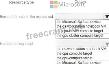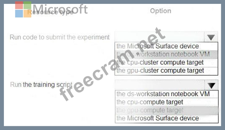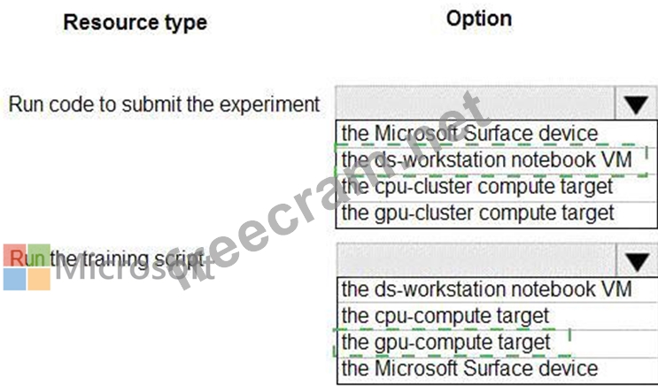 * an Azure Machine Learning compute target named with four CPU and GPU-based nodes You need to specify the compute resources to be used for running the code to submit the experiment, and for running the script in order to minimize model training time.