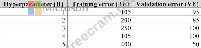 You are tuning a hyperparameter for an algorithm. The following table shows a data set with different hyperparameter, training error, and validation errors.