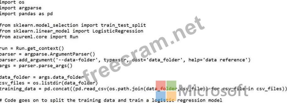 You have a script named train.py in a local folder named ./script that you plan to run as an experiment using an estimator. The script includes the following code to read data from the csv_files folder: