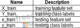 You use 75 percent of the data points for training and 25 percent for testing. You are using the scikit-learn machine learning library in Python. You use X to denote the feature set and Y to denote class labels.
