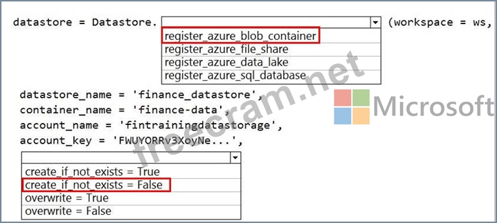 The finance team asks you to train a model using data in an Azure Storage blob container named finance-data.