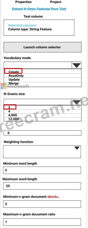 You are performing sentiment analysis using a CSV file that includes 12,000 customer reviews written in a short sentence format. You add the CSV file to Azure Machine Learning Studio and configure it as the starting point dataset of an experiment. You add the Extract N-Gram Features from Text module to the experiment to extract key phrases from the customer review column in the dataset.