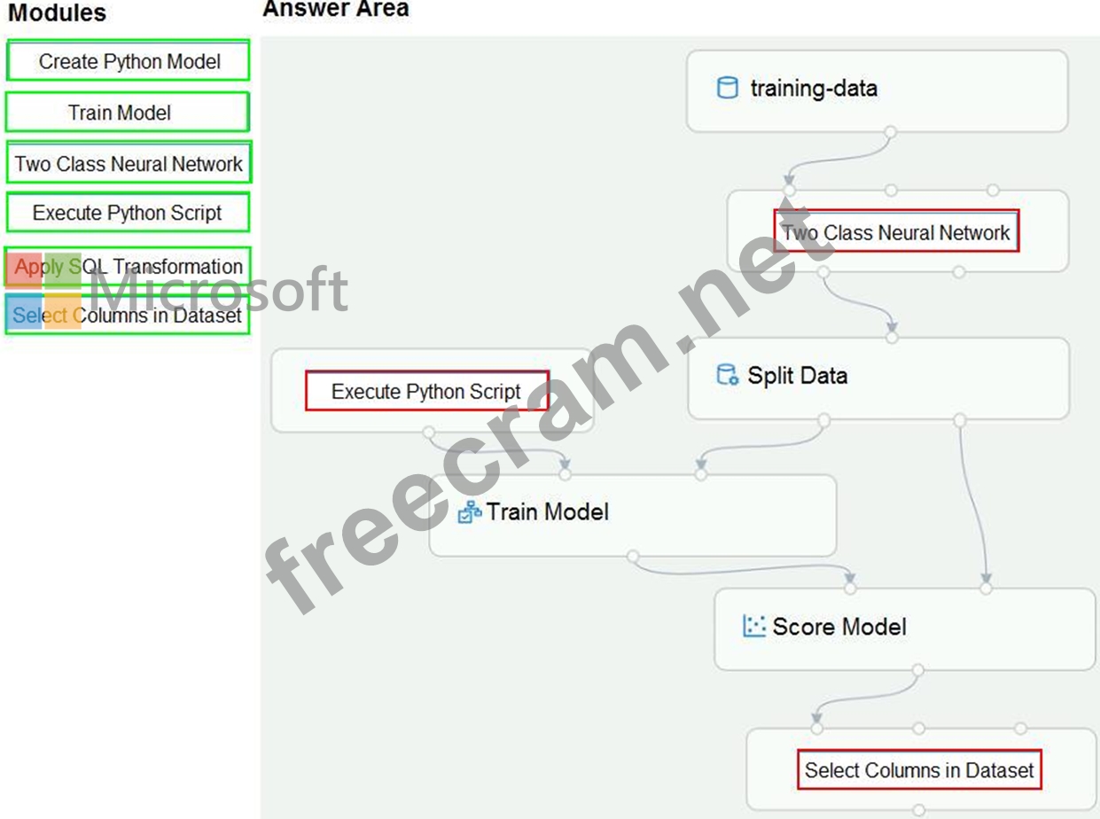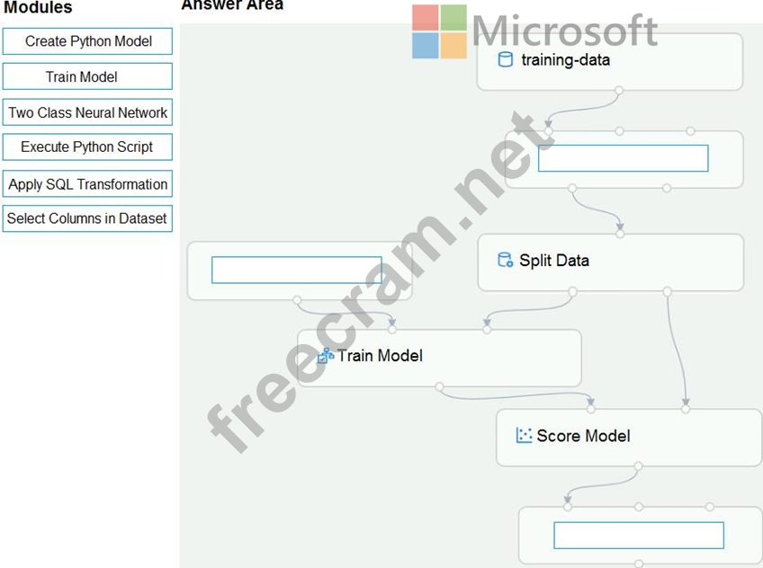 Return only the Scored Labels column by using the query SELECT [Scored Labels] FROM t1; Which modules should you use? To answer, drag the appropriate modules to the appropriate locations. Each module name may be used once, more than once, or not at all. You may need to drag the split bar between panes or scroll to view content.