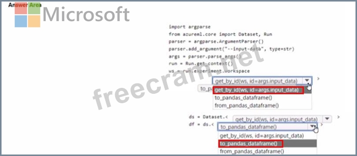 You plan to use the Azure Machine Learning SDK for Python vl to create a control script that will load the dataset into a pandas dataframe in preparation for model training The script will accept a parameter designating the dataset You need to complete the script.