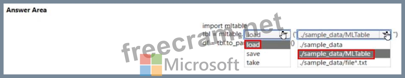 You write Python SDK v2 code to materialize the data from the files in the sample.data folder into a Pandas data frame. You need to complete the Python SDK v2 code to use the MLTaWe folder as the materialization blueprint. How should you complete the code? To answer, select the appropriate options in the answer area.