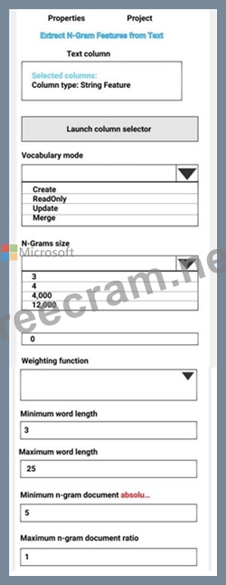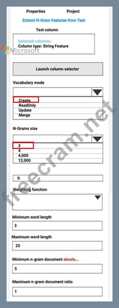 You are performing sentiment analysis using a CSV file that includes 12,000 customer reviews written in a short sentence format. You add the CSV file to Azure Machine Learning Studio and configure it as the starting point dataset of an experiment. You add the Extract N-Gram Features from Text module to the experiment to extract key phrases from the customer review column in the dataset.