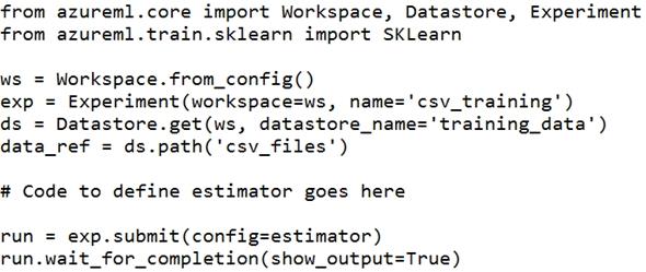 You need to configure the estimator for the experiment so that the script can read the data from a data reference named data_ref that references the csv_files folder in the training_data datastore.