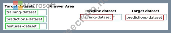 Which datasets should you use to configure the data drift monitor? To answer, drag the appropriate datasets to the correct data drift monitor options. Each source may be used once, more than once, or not at all. You may need to drag the split bar between panes or scroll to view content.