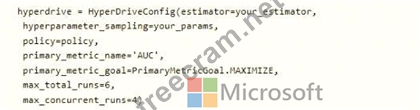 You want to use Hyperdrive to find parameters that optimize the AUC metric for the model. You configure a HyperDriveConfig for the experiment by running the following code: