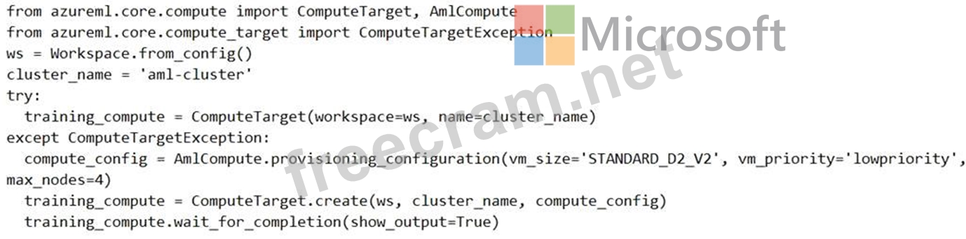 You are preparing to use the Azure ML SDK to run an experiment and need to create compute. You run the following code: