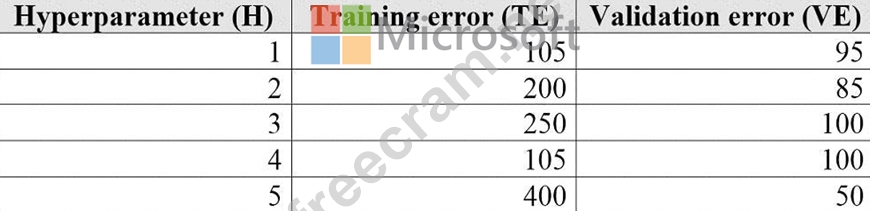 You are tuning a hyperparameter for an algorithm. The following table shows a data set with different hyperparameter, training error, and validation errors.