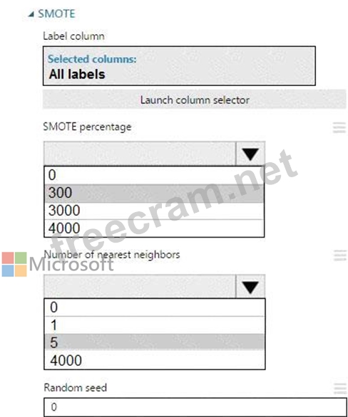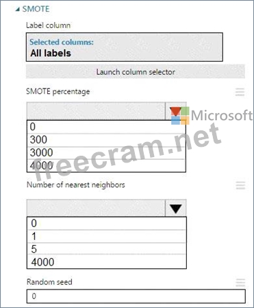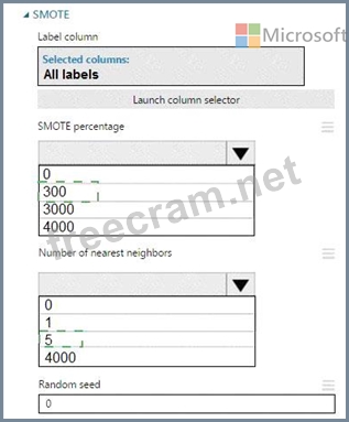 The training set is imbalances between two classes. You must increase the number of training examples for class 1 to 4,000 by using 5 data rows. You add the Synthetic Minority Oversampling Technique (SMOTE) module to the experiment.