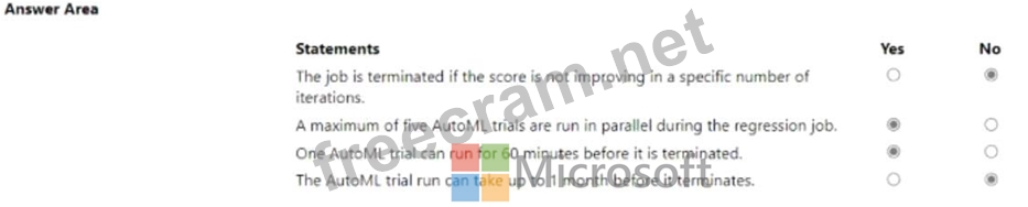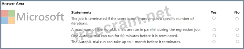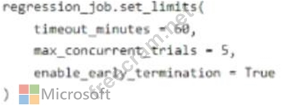You manage an Azure Machine Learning workspace. You configure an automated machine learning regression training job by using the Azure Machine Learning Python SDK v2. You configure the regression job by using the following script: