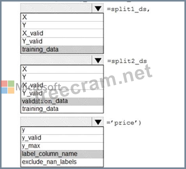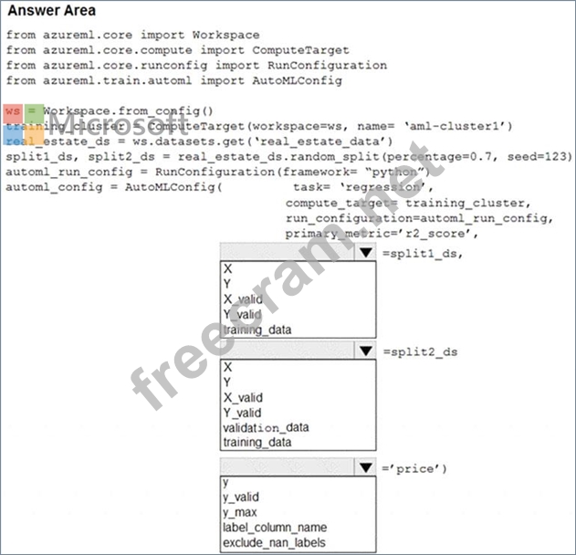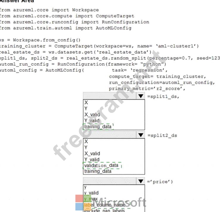 training_data, validation_data = dataset.random_split(percentage=0.8, seed=1) automl_config = AutoMLConfig(compute_target = aml_remote_compute, task = 'classification', primary_metric = 'AUC_weighted', training_data = training_data, validation_data = validation_data, label_column_name = 'Class' ) Box 3: label_column_name label_column_name: