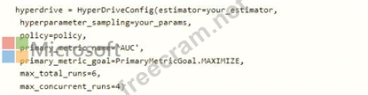 You want to use Hyperdrive to find parameters that optimize the AUC metric for the model. You configure a HyperDriveConfig for the experiment by running the following code: