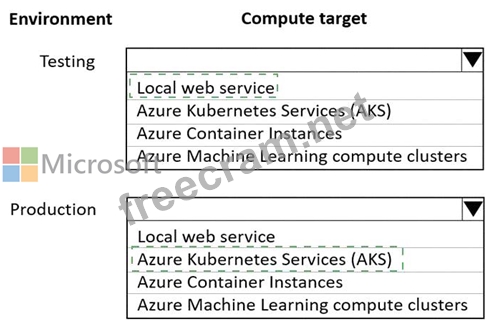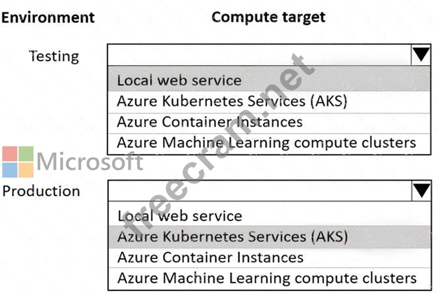 The compute target for testing must minimize cost and deployment efforts. The compute target for production must provide fast response time, autoscaling of the deployed service, and support real-time inferencing.