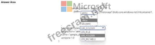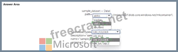 You manage an Azure Machine Learning won pace named workspace 1 by using the Python SDK v2. You create a Gene-al Purpose v2 Azure storage account named mlstorage1. The storage account includes a pulley accessible container name micOTtalnerl. The container stores 10 blobs with files in the CSV format.
