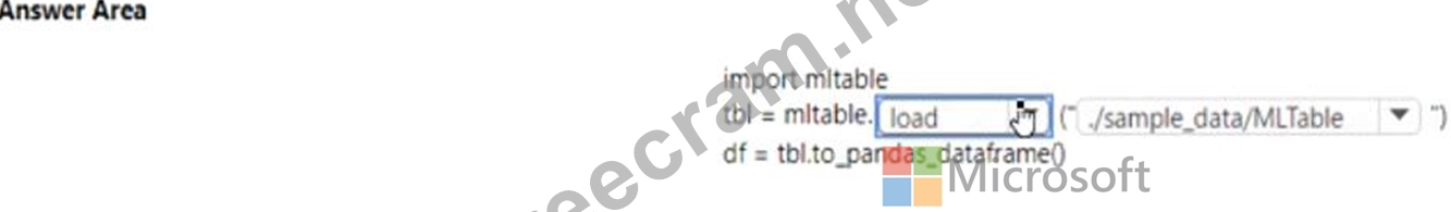 You write Python SDK v2 code to materialize the data from the files in the sample.data folder into a Pandas data frame. You need to complete the Python SDK v2 code to use the MLTaWe folder as the materialization blueprint. How should you complete the code? To answer, select the appropriate options in the answer area.