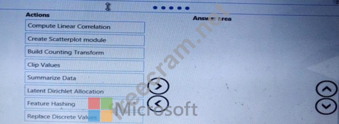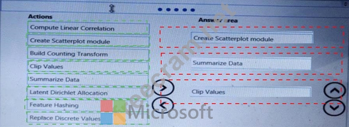 Which three Azure Machine Learning Studio modules should you use in sequence? To answer, move the appropriate modules from the list of modules to the answer area and arrange them in the correct order.