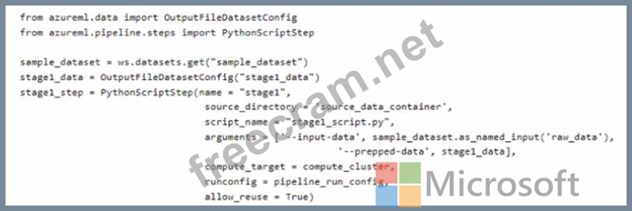 You create an Azure Machine Learning workspace. The workspace contains a dataset named sample.dataset, a compute instance, and a compute cluster. You must create a two-stage pipeline that will prepare data in the dataset and then train and register a model based on the prepared dat a. The first stage of the pipeline contains the following code: