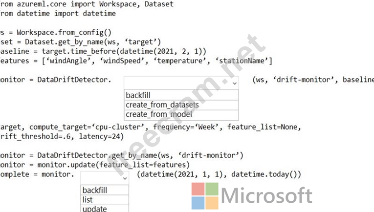 How should you complete the code segment? To answer, select the appropriate options in the answer area.