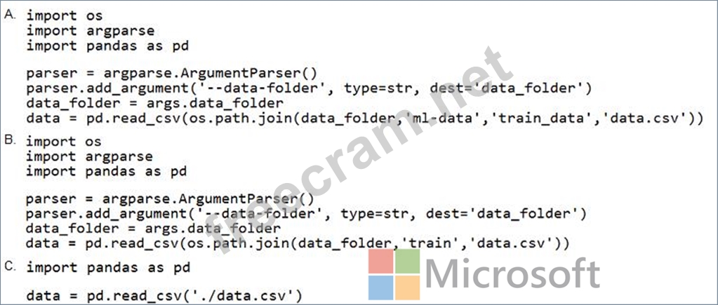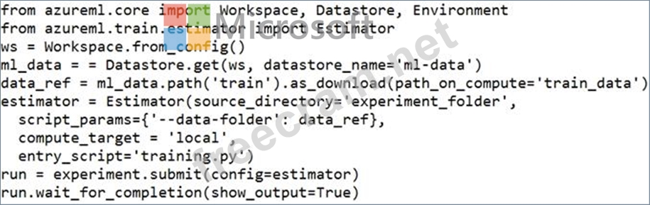 You define a datastore named ml-data for an Azure Storage blob container. In the container, you have a folder named train that contains a file named data.csv. You plan to use the file to train a model by using the Azure Machine Learning SDK.