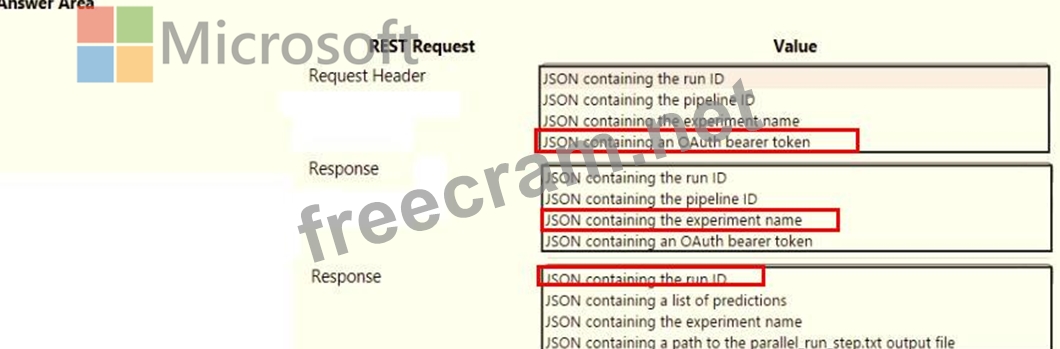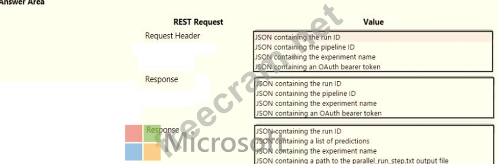 Which values should you use in the REST request and to expect in the response? To answer, select the appropriate options in the answer area.