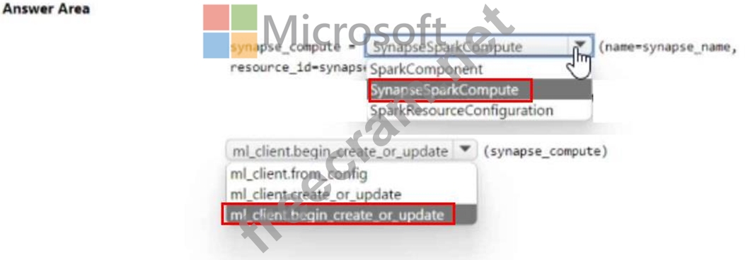 You need to use the Azure Machine Learning Python SDK v2 to define and configure the Synapse Spark pool asynchronously in the workspace as dedicated compute How should you complete the rode segment? To answer, select the appropriate options in the answer area.