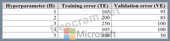 You are tuning a hyperparameter for an algorithm. The following table shows a data set with different hyperparameter, training error, and validation errors.