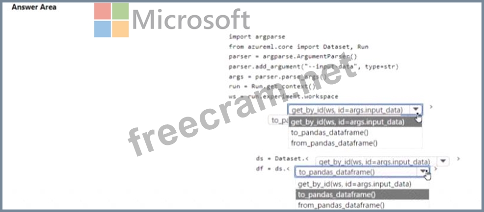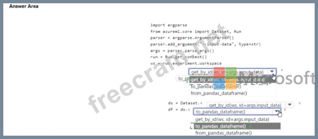 You plan to use the Azure Machine Learning SDK for Python vl to create a control script that will load the dataset into a pandas dataframe in preparation for model training The script will accept a parameter designating the dataset You need to complete the script.