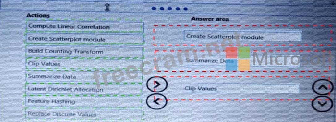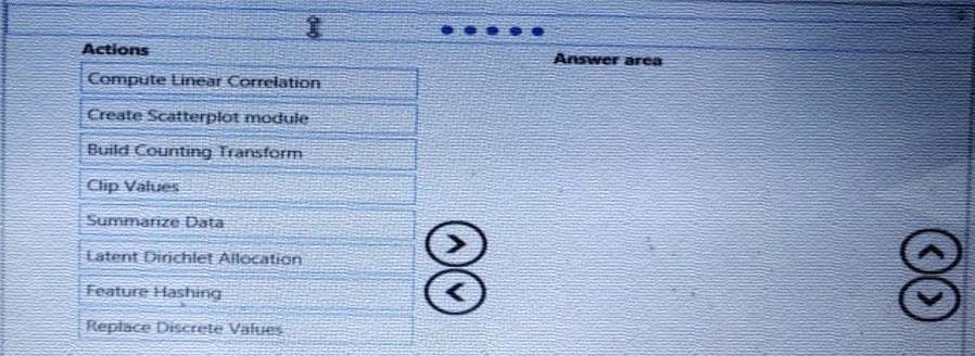 Which three Azure Machine Learning Studio modules should you use in sequence? To answer, move the appropriate modules from the list of modules to the answer area and arrange them in the correct order.