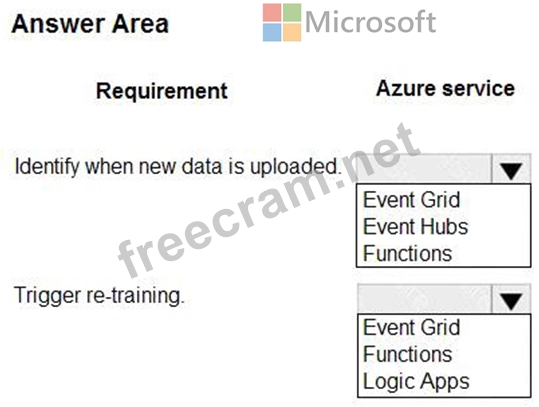 To set up a solution for retraining a model when new data is uploaded to Azure Blob Storage, you can use a combination of Azure services. Here are the appropriate services to use for each requirement: