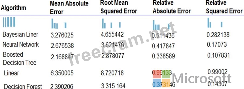 You are developing a linear regression model in Azure Machine Learning Studio. You run an experiment to compare different algorithms.