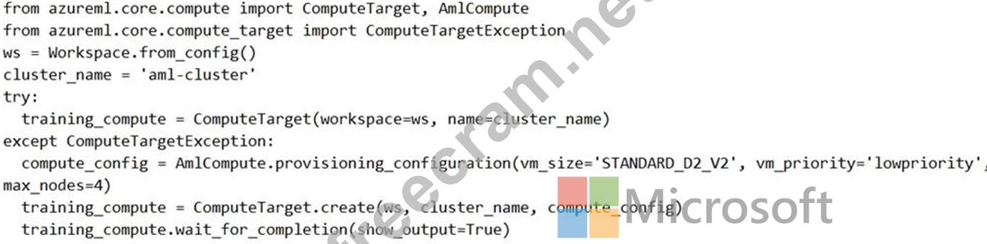 You are preparing to use the Azure ML SDK to run an experiment and need to create compute. You run the following code: