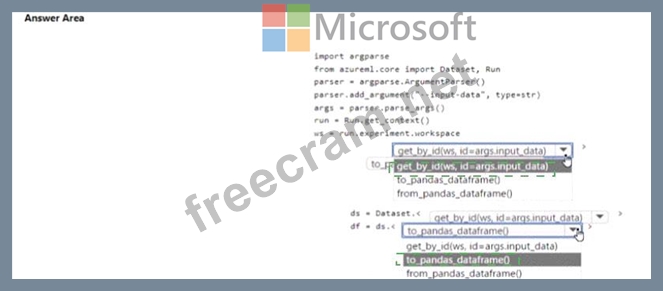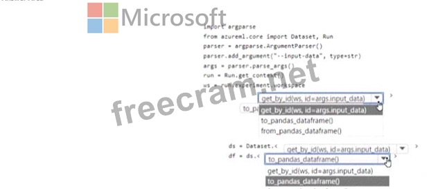 You plan to use the Azure Machine Learning SDK for Python vl to create a control script that will load the dataset into a pandas dataframe in preparation for model training The script will accept a parameter designating the dataset You need to complete the script.
